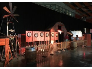L'éolienne peut-être mis en location avec des façades Far West, portique entrée sortie, toile de jute, tonneau, cactus, roue, caisse bois.